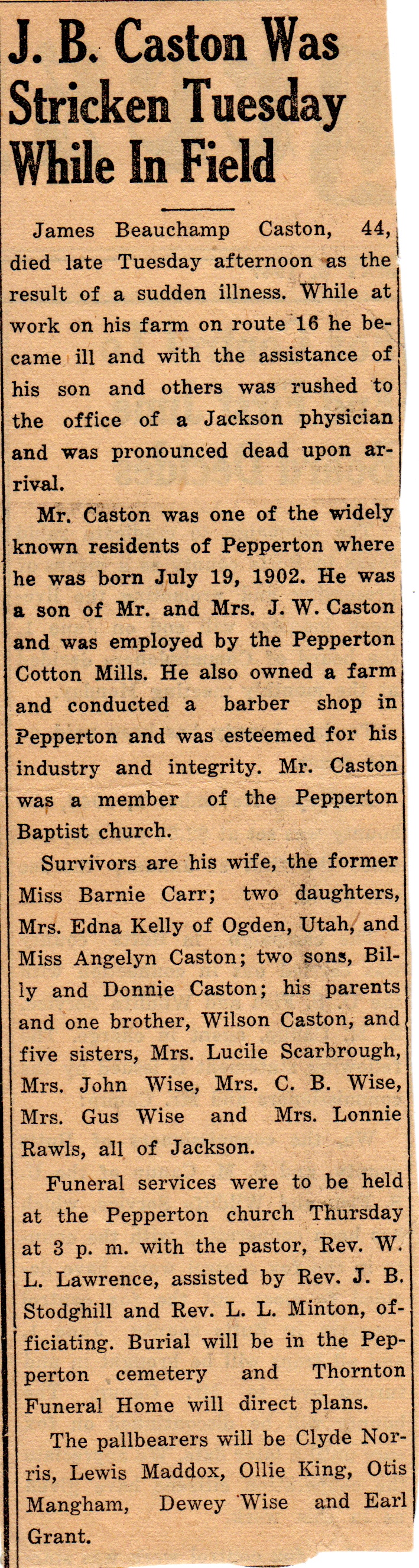 Located close to the mill was a pond where people of the village would catch fish. There was also a community hog pen where members of the community could keep their personal livestock. I remember one of my older brothers talking about going to play at the “Pep Hog Pen”. By the time I came along as a child, I would not get to play in the “Pep Hog Pen”, but I would catch my first fish in “Pep Pond”. I would spend a lot of time in “Pep” as a child. I would get on my bicycle and ride down the street until I came to the service road that ran in front of the mill. I would hear the activity in the mill from some open windows as I bicycled past the cars of the people who were working inside. By this time, my grandmother no longer worked at the mill. I would turn my bike onto Mill Street and pedal to my grandmother’s front porch. I would walk in and say, “Hey Bon Bon!” We all called her Bon Bon, but her name was Bonnie. One of my older cousins started calling her that name when he was a toddler and the name stuck. She would then ask me if I wanted a “Cocola”. I would always answer yes. She would always keep the small Coca-Cola bottles in her refrigerator. They were always a special treat. They were ice cold and I always enjoyed “popping” the top off with the bottle opener she had mounted on her kitchen wall. She had been a widow now for over 20 years. I never met my grandfather. He died in 1947. He passed away from a heart attack just shy of his 45th birthday. He had realized his dream of buying some farm land and that is what he was doing when he fell ill. He was working in his field, tilling the soil. My mother told me he had always been industrious and was always on the go. Whether working in the mill, the barber shop or farming or hunting, he had a zest for life. He loved to bird hunt and many a quail would be fried up by my grandmother and served on their kitchen table. My grandfather’s younger brother, Wilson “Toots” Caston, was then the only surviving Caston son. He would go on to build the best pulled pork barbeque stand in the state of Georgia, “Fresh Air BBQ”. He would be a respected businessman and community leader for the remainder of his life.